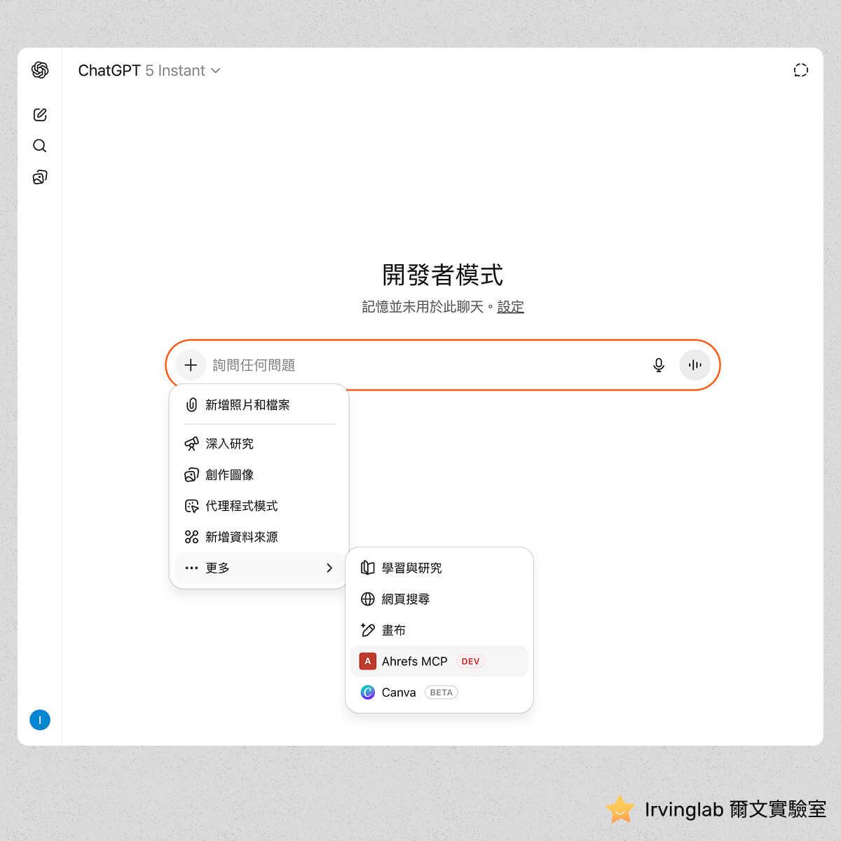 這是透過 ChatGPT 開發者模式(Developer Mode) 新增連接器(Connector)完成的。只需輸入 Ahrefs MCP 伺服器 URL:https://api.ahrefs.com/mcp/mcp,並透過 OAuth 驗證 授權,即可讓 ChatGPT 成為你的 Ahrefs 智能分析助手。從此能直接查詢 Site Explorer、Rank Tracker、Domain Rating、Keywords、Paid Pages 等真實數據,像操作資料庫一樣自然。