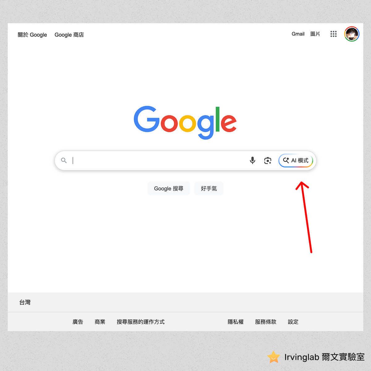 Google 在首頁搜尋欄右側有開始推出「AI 模式」的按鈕。且在目前台灣/中文版 Google 搜尋中,AI 模式(AI Mode)並不是預設呈現,而是在搜尋結果頁(SERP)上以一個「選項」或「標籤」的形式出現,通常位在左側與其他搜尋分類(如「全部」「圖片」「影片」)平行的位置。