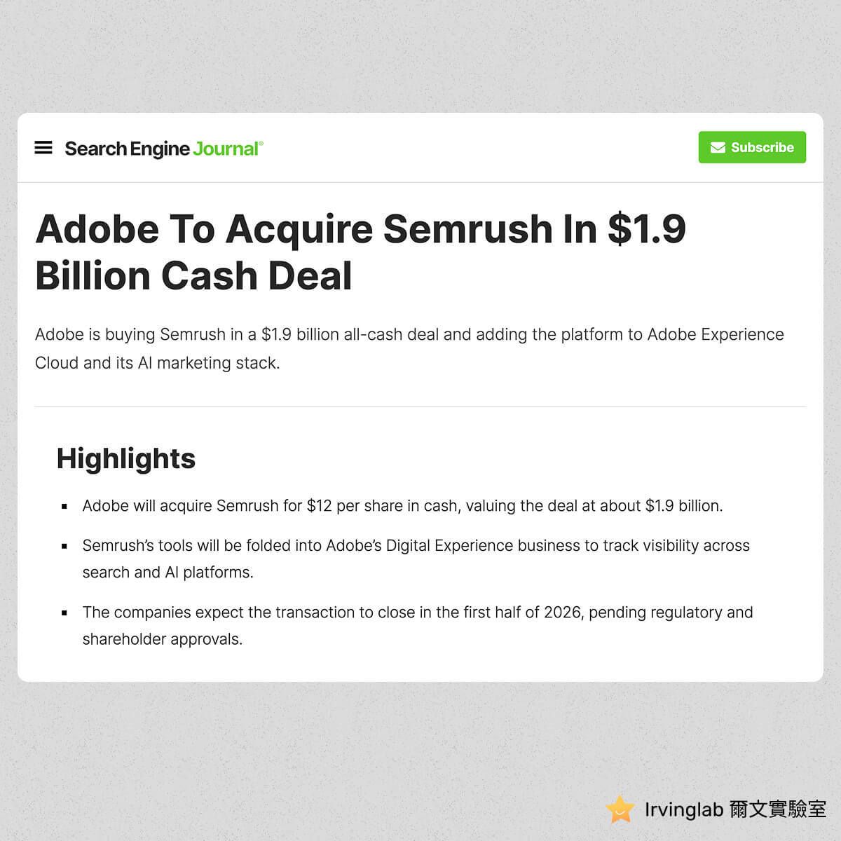 Adobe 宣布以 19 億美元現金收購 SEO 平台 Semrush,將其納入 Adobe Experience Cloud 與 AI 行銷生態系。此交易預計於 2026 年上半年完成,需經監管與股東批准。